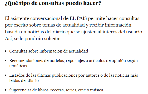 Una de las características más importantes de este nuevo asistente es que Vera ofrece respuestas basadas en los archivos y publicaciones de EL PAÍS, Cinco Días y todas las verticales del grupo. Con esto, garantizan a sus suscriptores que la información que obtendrán al conversar con este asistente será una información veraz y contrastada. Los usuarios también pueden pedir recomendaciones de noticias, artículos de opinión, reportajes e incluso películas, música o libros.