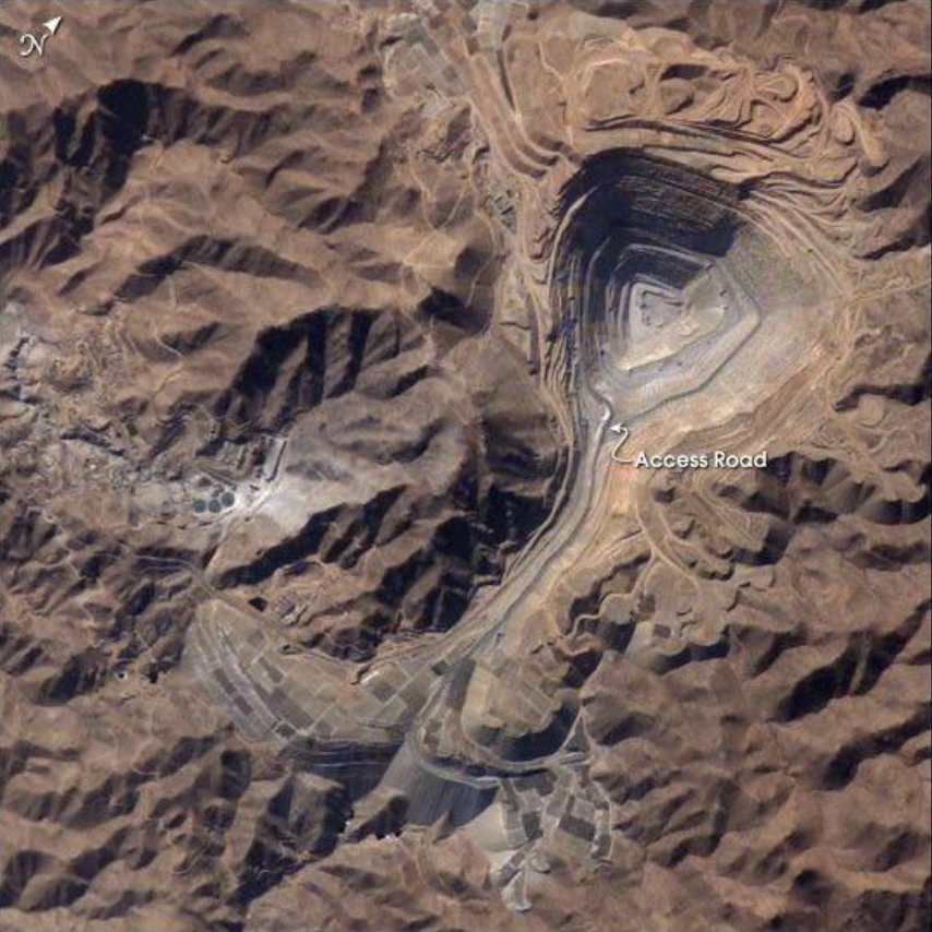 Mina de cobre de Toquepala, al sur del Perú. Copper Mine, Southern Peru. Astronaut photograph ISS007‑E‑15222 (International Space Station), NASA; image content provided by M. Justin Wilkinson (Lockheed Martin / Earth Observations Laboratory, Johnson Space Center). https://science.nasa.gov/earth/earth-observatory/toquepala-copper-mine-southern-peru-3869/
