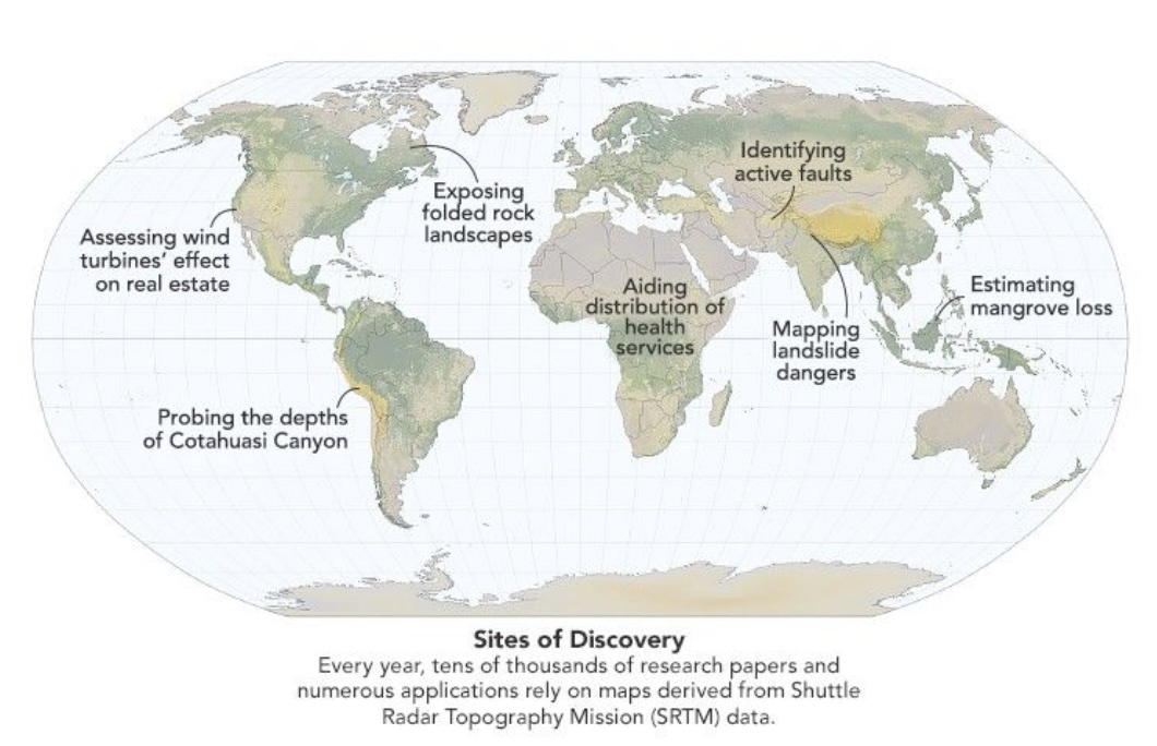 Este mapa mundial titulado «Sitios de Descubrimiento» (Sites of Discovery) ilustra la importancia de los datos obtenidos por la Misión Topográfica de Radar del Transbordador (SRTM). NASA Earth Observatory image by Michala Garrison, using topographic data from the Shuttle Radar Topography Mission (SRTM). https://science.nasa.gov/earth/earth-observatory/treasured-maps-153210/