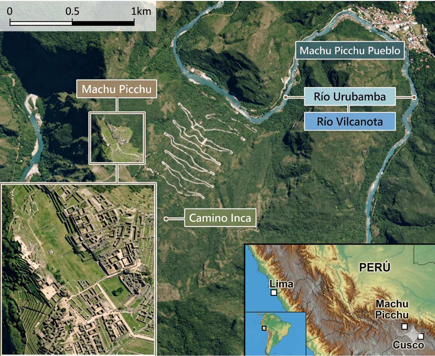 Mapa de ubicación de Machu Picchu y Machu Picchu Pueblo. El rio Aguas Calientes, cruza Machu Pichu pueblo y vierte sus aguas en el rio Urubamba. Modificado de la publicación de M. H. Bulmer y T. Farquhar: Diseño e instalación de un prototipo de sistema de monitoreo de riesgos geológicos.